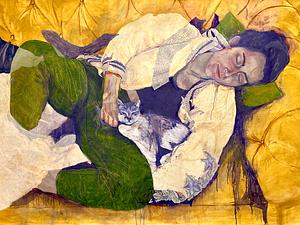 fantastic painting of claire laying on the couch with her taylor swift™ folklore hoodie, and our kitty <3