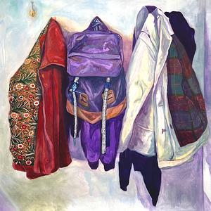 heres the line up of the j-hooks in our room <3 cute red jacket, purple backpack, and an ex's pea coat